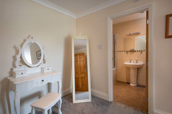 A lovely bedroom with double bed with a luxury mattress and premium quality bedlinen, wardrobe and dressing table. En-suite with a shower cubicle.